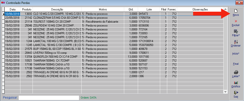 1- Ao iniciarmos a emissão da Nota de Perda de Medicamentos, vamos verificar se entre eles existe algum medicamento controlado. Se for o caso, nosso primeiro passo é acessar a tabela “Perdas”.