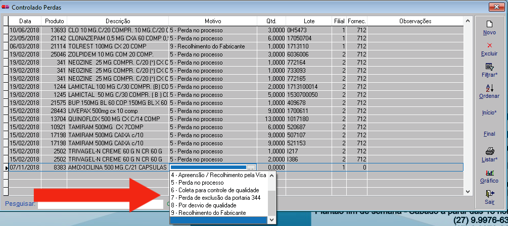 3- Irá aparecer um novo registro, onde vamos informar o código do produto, o motivo da perda (seja vencimento, avaria , furto, coleta para controle, etc), a quantidade e lote. Observe abaixo:
